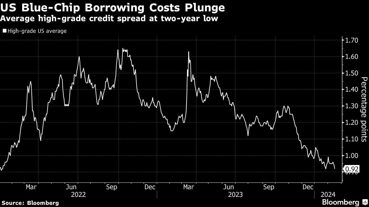 With investors more optimistic about the economy now that the Fed has stopped tightening policy, risk premiums have declined. The extra yield investors demand to hold investment-grade corporate bonds instead of US Treasuries has declined to an average of just 92 basis points, the lowest in two years, according to data compiled by Bloomberg. At the same time, the average blue-chip yield is down to about 5.4% from as much as 6.43% in mid-October.