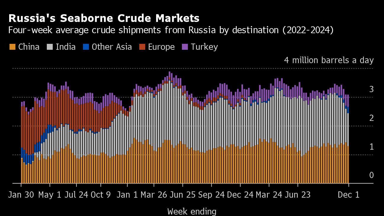The price cap was originally designed to limit the amount of money Russia makes from its oil sales while keeping global oil prices from skyrocketing. With prices for oil slipping amid forecasts of a global surplus in 2025, Ukraine’s allies are open to taking more aggressive action, Bloomberg previously reported.