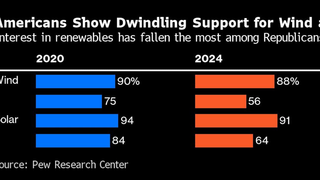Support for more solar farms has fallen from 90% four years ago to 78% as of May, while interest in expanding wind farms has fallen from 83% to 72% in that period, the Washington-based group said Thursday in its latest report. The decline was particularly pronounced among Republicans, with one in five fewer showing support for those renewable energy sources than in May 2020.
