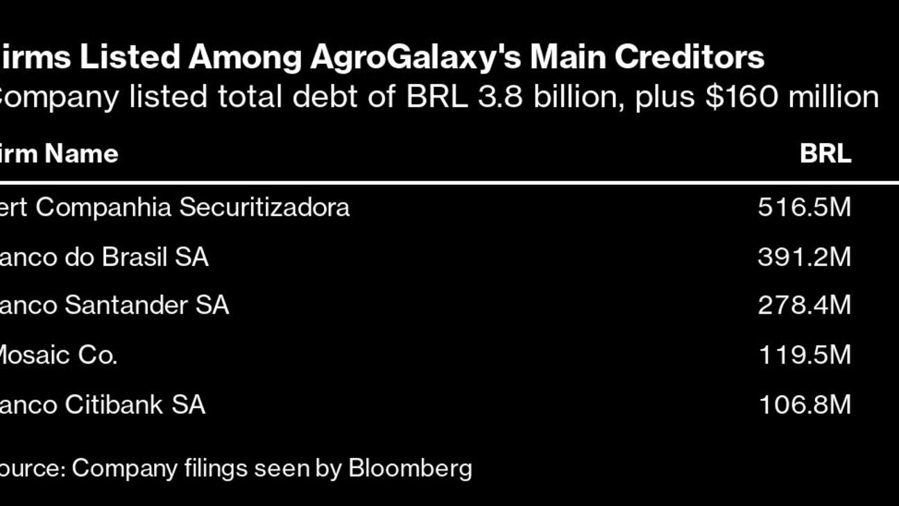 AgroGalaxy listed debts of about 3.8 billion reais ($693 million) in local currency and another $160 million, according to documents seen by Bloomberg. The company, which sells crop inputs to farmers, sought protection from creditors on Wednesday ahead of looming maturities and amid a mass resignation of several of its top executives.