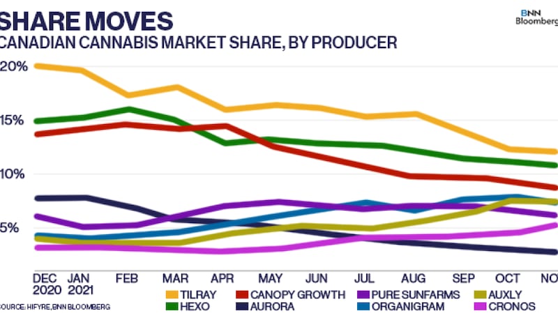 Of the bigger cannabis producers, most of them lost market share in November, led by Canopy Growth and Village Farms International's Pure Sunfarms. Only Auxly Cannabis showed a gain in share during the quarter, and it now represents the third-biggest cannabis producer in the country with nearly 11 per cent of the market. "The recent appearance of Auxly, Cronos, and Valens flower products in high rankings in the Top 100 Products list supports the notion that cannabis consumers respond well to newness, whether that is new genetics and/or newer entrants," Chen said.