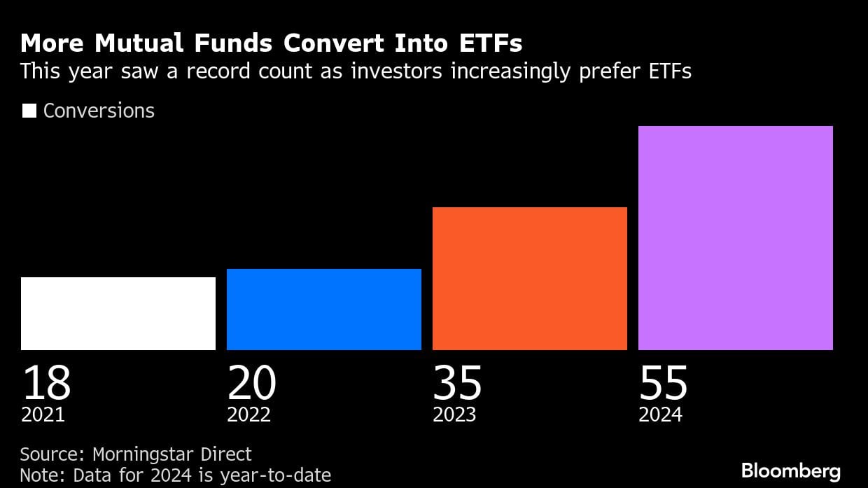 And that tally is only expected to grow. Bank of America Corp. strategists foresee about 400 mutual funds with over $325 billion in total assets that are ripe for ETF conversions, with $3 billion of that amount anticipated to occur in 2025.