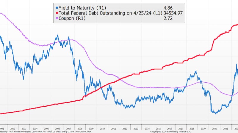 Back to the impact of the supply side of government debt; it’s getting more expensive as part of the deficit on an absolute and relative basis. This chart shows the current yield on all U.S. Treasury debt combined.