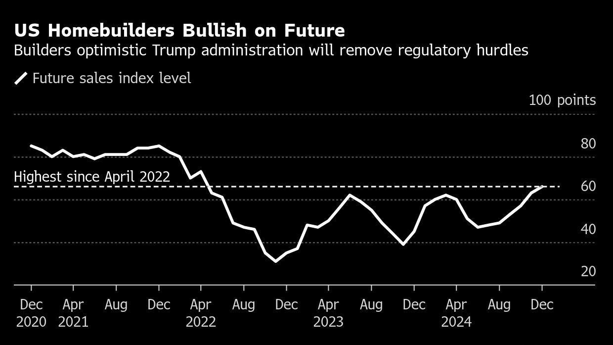 (Bloomberg) -- Home builders’ outlook for the next six months rose to the highest in more than 2 1/2 years on optimism that the upcoming Trump administration will help remove construction regulatory hurdles and boost sales.