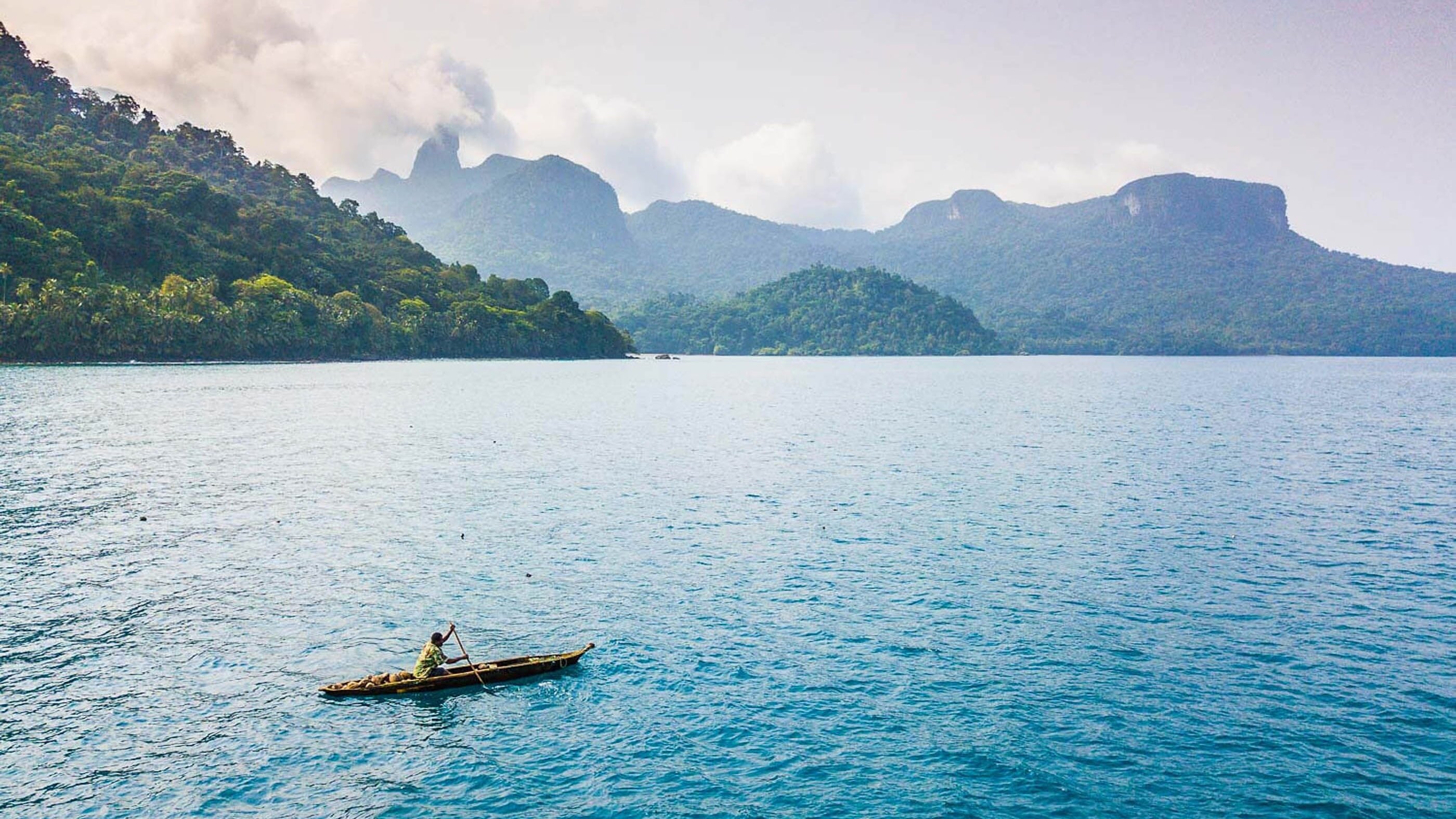 That’s how he found Príncipe, where jungles crash into pearlescent beaches dotted with Jurassic-looking palms and vistas are interrupted by little more than the odd thatched roof and emerald hills. The seas hover around 80F (27C), and Technicolor reefs host vast troves of rare creatures endemic to the Gulf of Guinea.