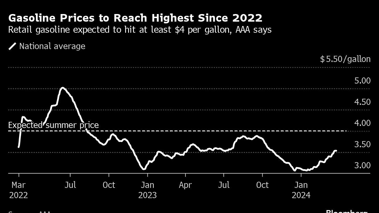 (Bloomberg) -- US pump prices are likely to climb to the highest since the summer of 2022 — to $4 a gallon — as oil rises amid supply concerns, according to the AAA automobile club.